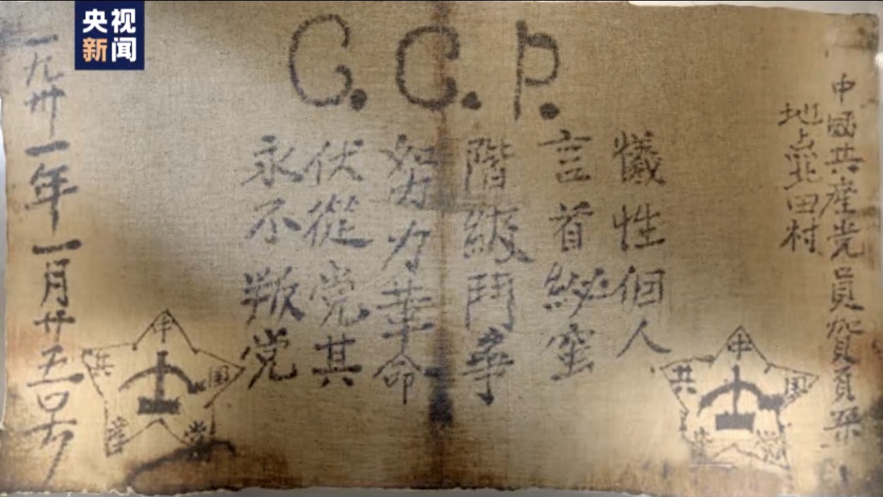 这是中国共产党历史上现存早期的入党誓词。已经褪色的破旧红布上,用毛笔书写着24个字:“牺牲个人,严守秘密,阶级斗争,努力革命,服从党纪,永不叛党”,落款时间1931年1月25日。写下誓词的,是江西贫苦农民贺页朵,因为识字不多,24字誓词中,就有6个错别字。