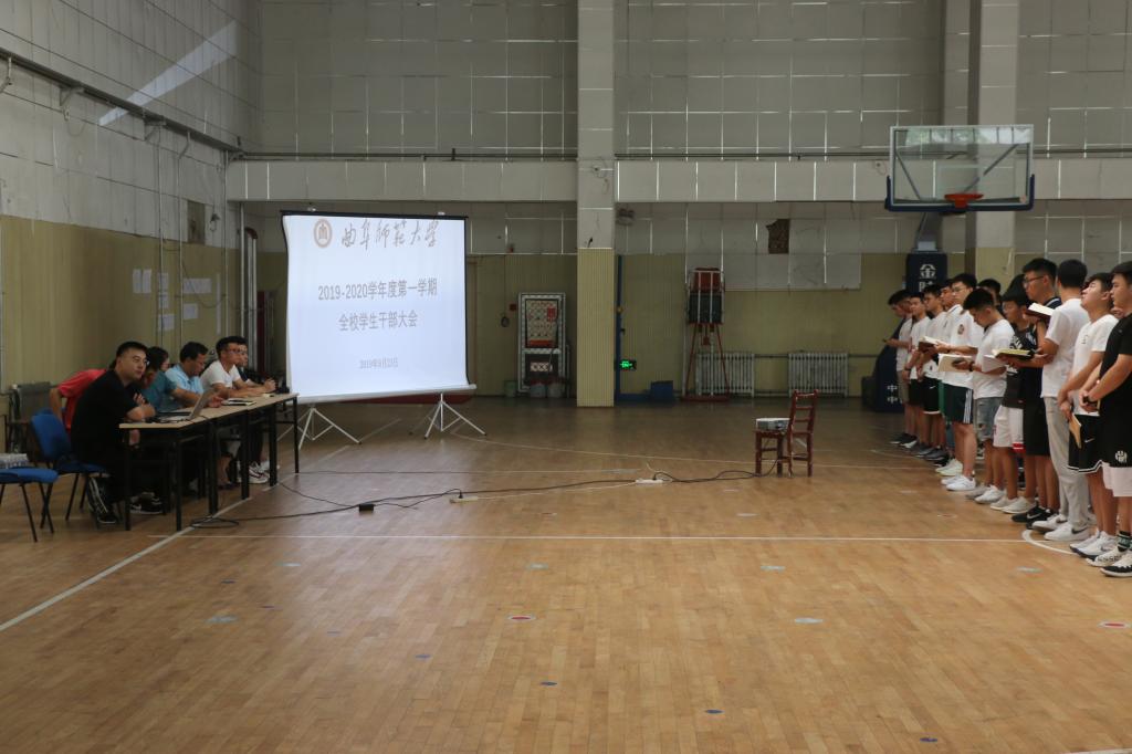 团委在学院新球馆召开了2019—2020学年度第一学期全院学生干部大会。本次大会由团委书记梁贺涵主持,党委副书记展利民、辅导员刘京、辅导员唐海峰、各班级班主任、班主任助理及全院主要学生干部共同参加了此次大会。