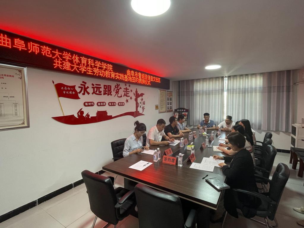 2022级辅导员王冰与奎文社区党委书记孔艳丽签订劳动教育实践基地协议书,体育学部党委副书记马振华与鲁城街道人大工作委员会副主任刘薇共同为劳动教育实践基地揭牌。