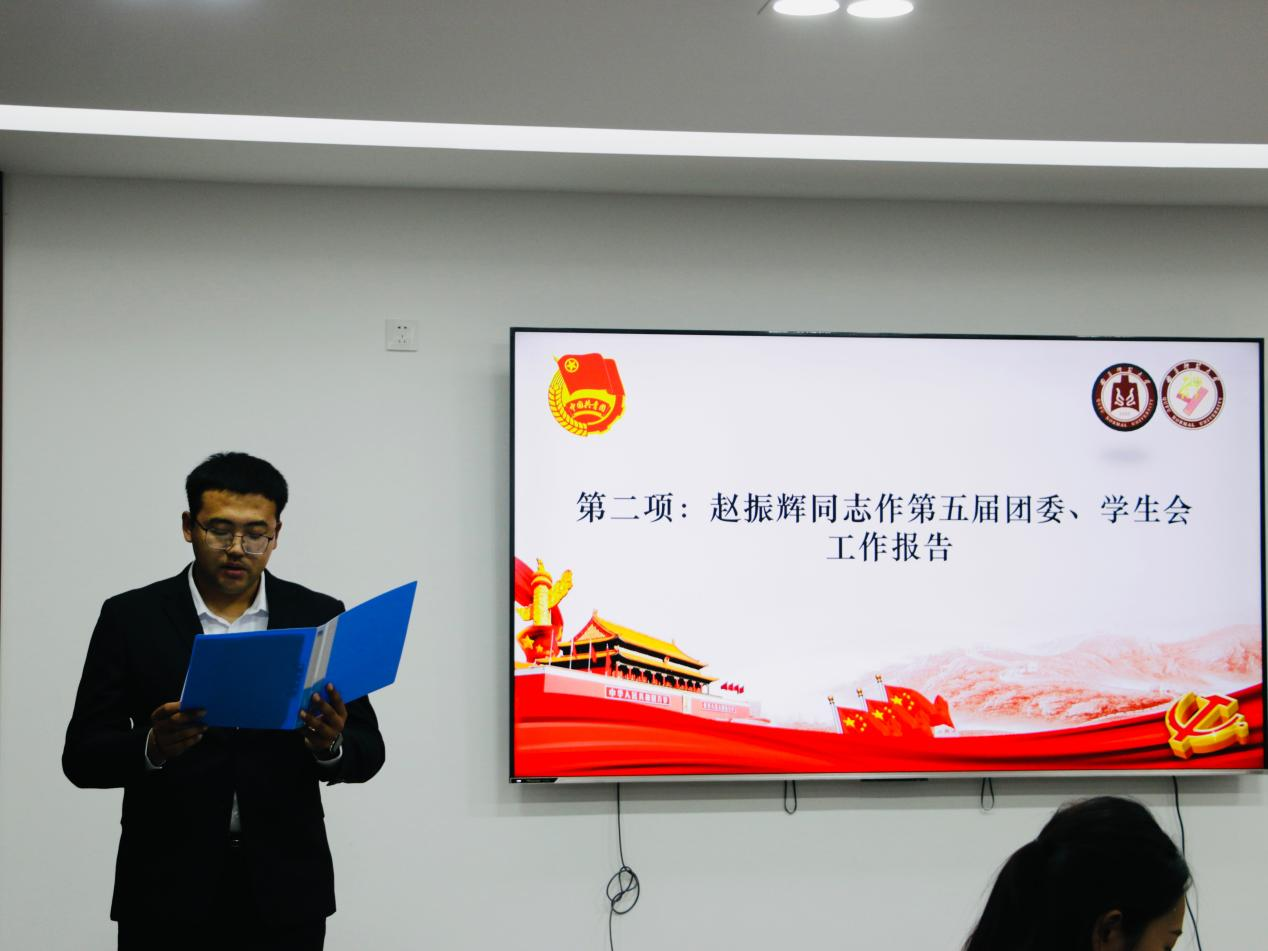 第五届学生会主席赵振辉代表第五届团委、学生会作工作报告。赵振辉从思想引领、内部建设、文化建设等六个方面回顾了第五届团委、学生会这一年的工作成果,同时指出工作中尚存的不足,表达了第五届团委、学生会学生干部的心得体会和收获成长,祝福第六届团委、学生会工作能够更上一层楼。
