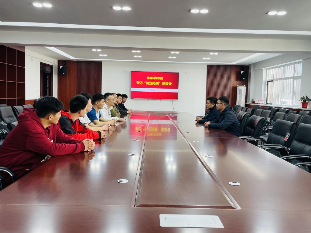 在学院会议室开展书记“访企拓岗”促就业专项座谈会。山东魏桥创业集团有限公司代表、体育学部党委书记刘敏、毕业班辅导员唐海峰和学生代表参加座谈会。