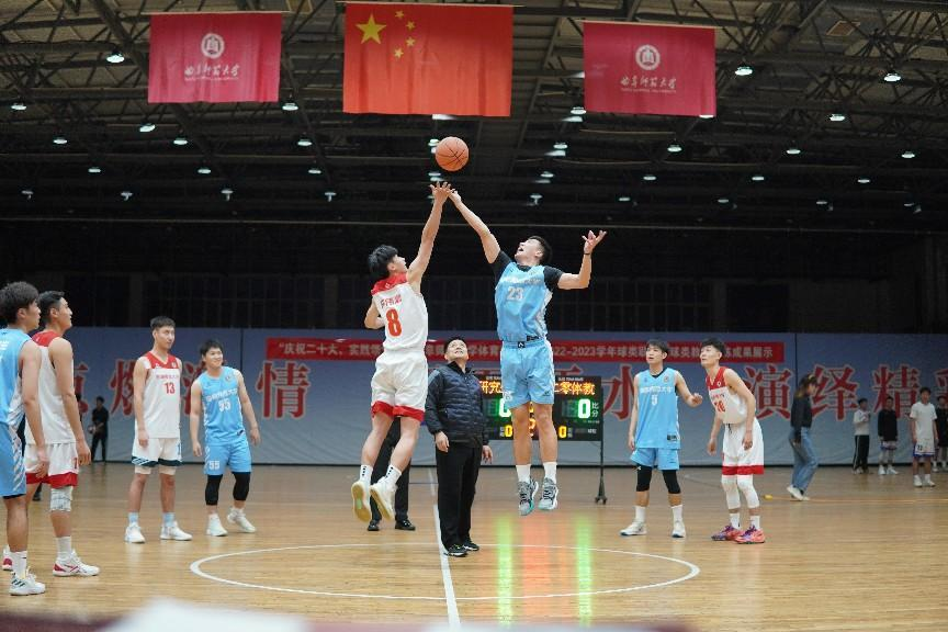 2022-2023学年球类联赛暨球类教学训练成果展示大会正式开幕,并为2022-2023学年球类联赛揭幕战跳球。