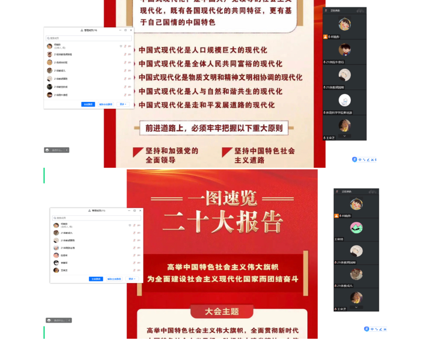体育科学学院团委组织各团支部团员通过线上会议、谈学习心得等多种形式学习中国共产党第二十次全国代表大会报告,会议由各团支部团支书组织进行。