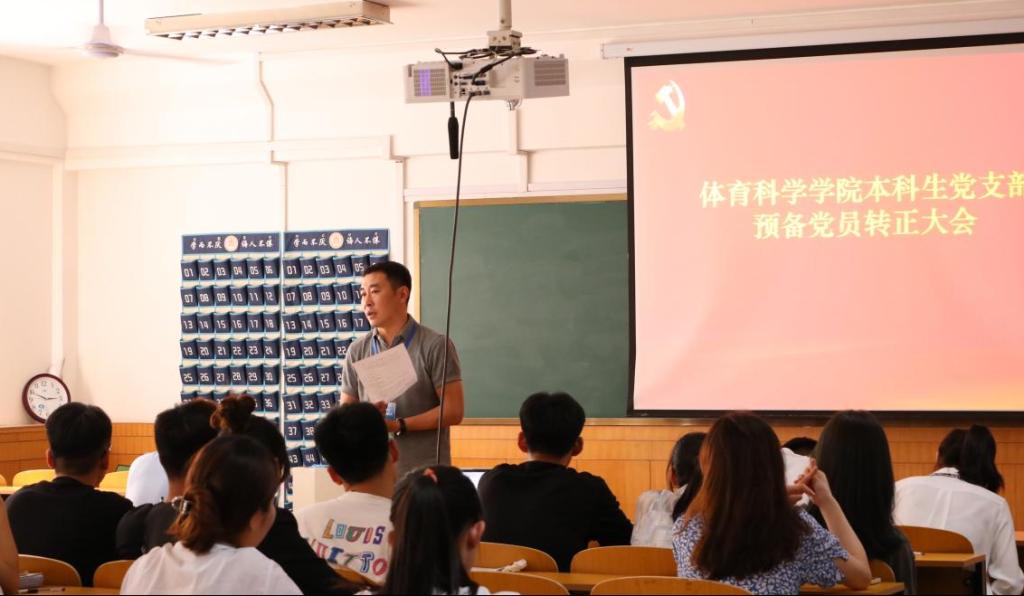 本科生党支部于系楼110教室召开预备党员转正大会,讨论张淑莎等43名预备党员是否转为正式党员的议题。本次会议由党支部书记唐海峰主持,党委副书记马振华指导,本科生党支部全体党员参加。