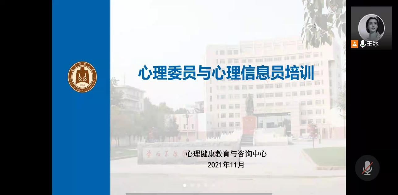 于11月10日晚6:30在系楼110教室进行心理委员和心理信息员培训会议,部分学生参加线上会议培训,会议由心理辅导员王冰老师主持。