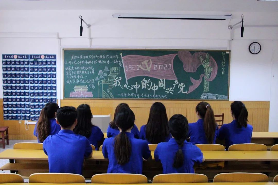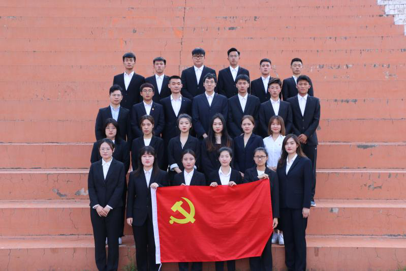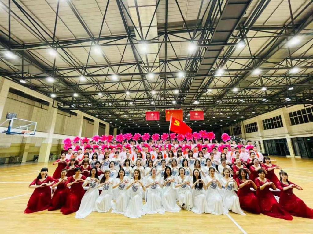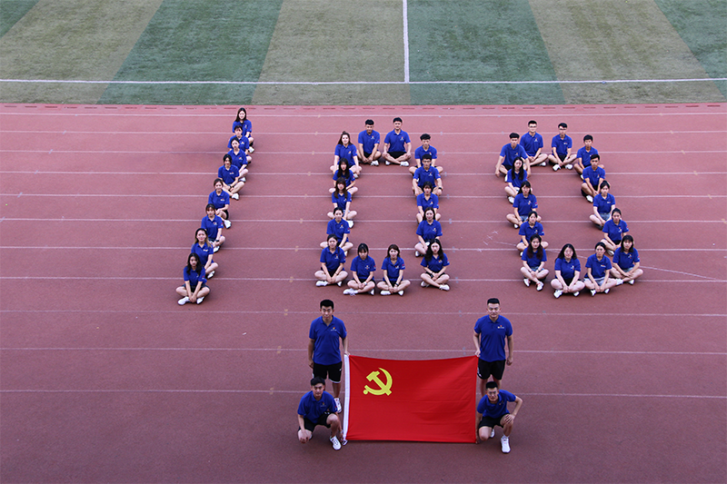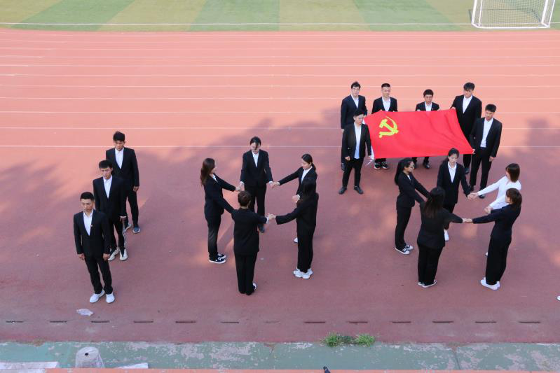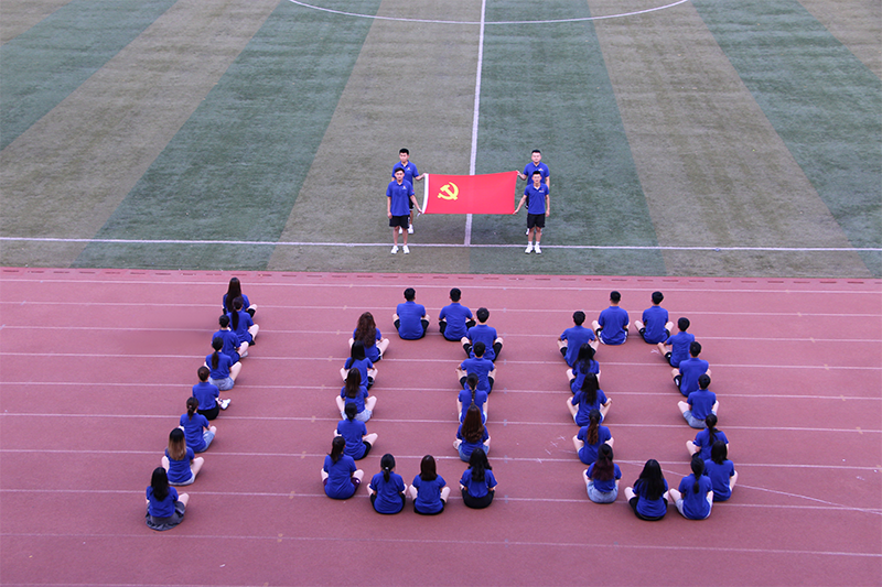 缀有金黄色党徽图案的旗帜迎风飘扬,深刻的烙在同学们的心中。党旗合影心向党,同学们怀着无比坚定的信念排成“100”的字样,用青年人无限创意庆祝党的100周年华诞!