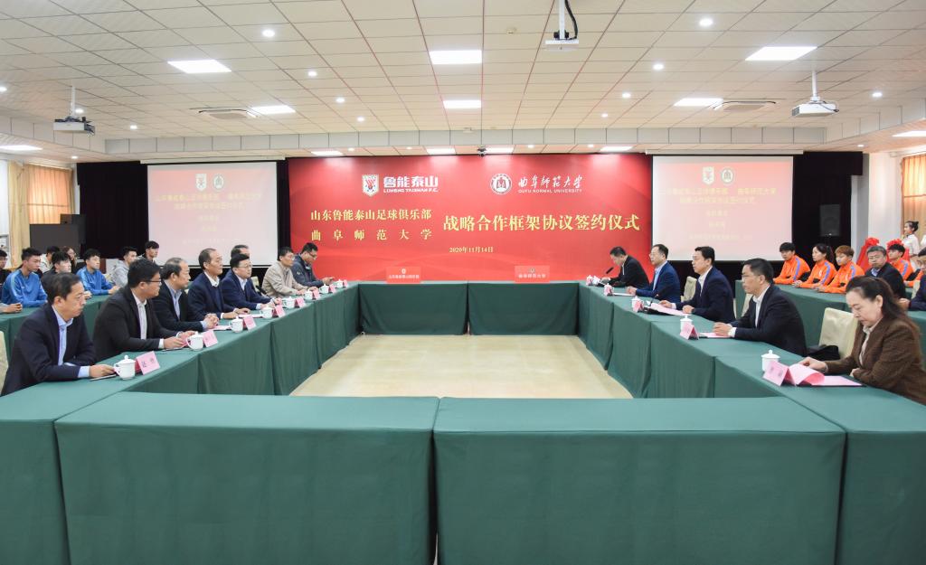 与山东鲁能泰山足球俱乐部战略合作框架协议签约仪式在我校举行。国网山东省电力公司副总经理、鲁能体育文化分公司总经理、党委副书记兼山东鲁能泰山足球俱乐部总经理孙华,山东省教育厅体卫艺处处长孙乐为,济南市体育局副局长、济南奥体中心党委书记吴志东,山东体育协会会长、山东大学体育学院院长孙晋海,曲阜师大校长张洪海、副校长胡钦晓等出席了签约仪式。鲁能体育文化分公司、济南奥体中心场馆,我校国内合作处、招生办公室、2048核基地