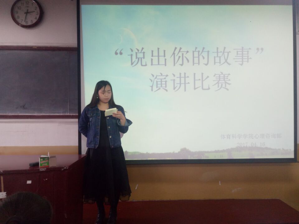 团委学生会心理咨询部“说出你的故事”演讲比赛在院楼301教室举行。参加本次比赛的主要成员有团委学生会主席尚佳、心理咨询部全体成员及参加本次比赛的同学。本次比赛由李宗林主持。