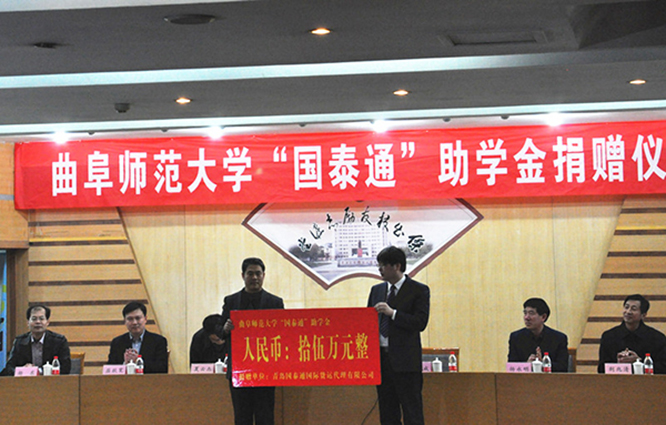 “国泰通”助学金捐赠仪式在我校孔子会堂隆重举行。出席捐赠仪式的有校友孙国成,学校副校长扈庆学,学校办公室主任夏云杰,学校学生工作处处长杨永明,学校团委书记屈跃宽,学校招生就业处副处长杨东,我院党总支书记荆兆清,副书记展利民,团总支书记赵峰,辅导员李娜。本次会议由学校办公室主任夏云杰主持,副校长扈庆学、青岛国泰通国际货运代理有限公司董事长、2048核基地