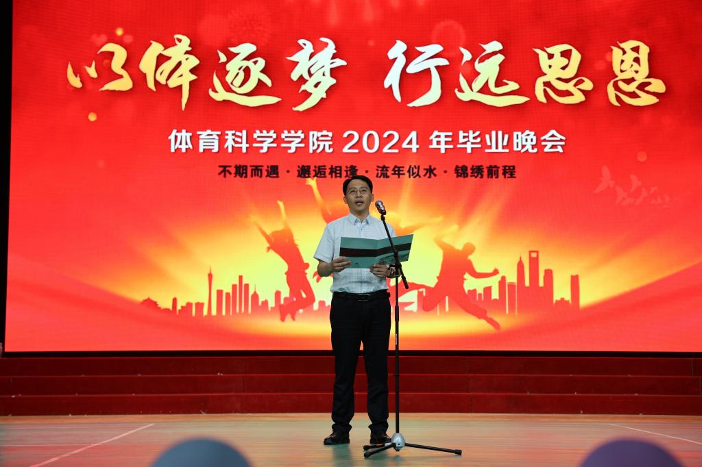 晚会伊始,体育学部党委书记许怀祥代表学院全体师生致辞。许怀祥在致辞中回顾了毕业生们在曲园的求学历程和成长经历,表达了毕业生们成长与蜕变的肯定,并向全体毕业生的未来发展寄予了殷切期望和真挚祝福。