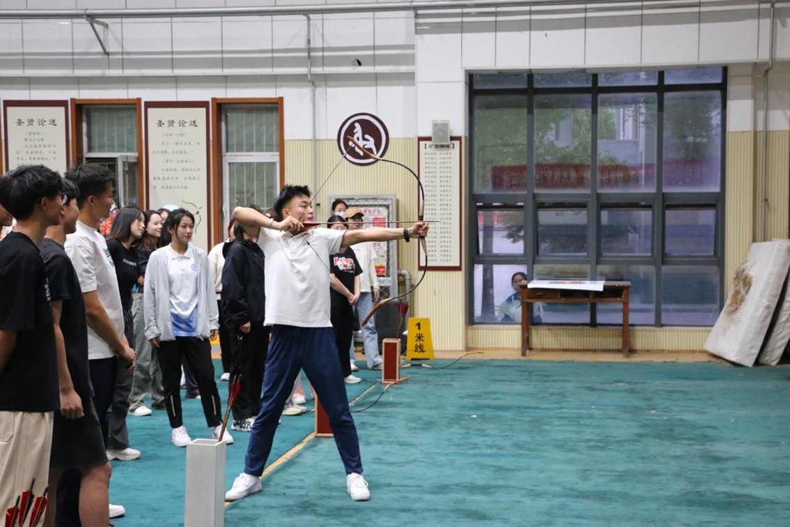 礼仪环节结束后,进入了紧张而又兴奋的射箭技能培训阶段。朋辈导师从基础站姿、握弓手法、瞄准方法到撒放动作,逐一示范并指导学生练习。学生们在朋辈导师的耐心指导下,从最初的生疏到逐渐掌握要领,每一次箭矢离弦,都伴随着技术的进步和自信心的提升。场地上,箭矢破空之声不绝于耳,展现了力与美的完美融合。