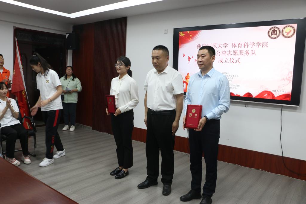 曲阜市彩虹公益服务中心理事长康绪虎为体育学部党委副书记马振华和2048核基地
