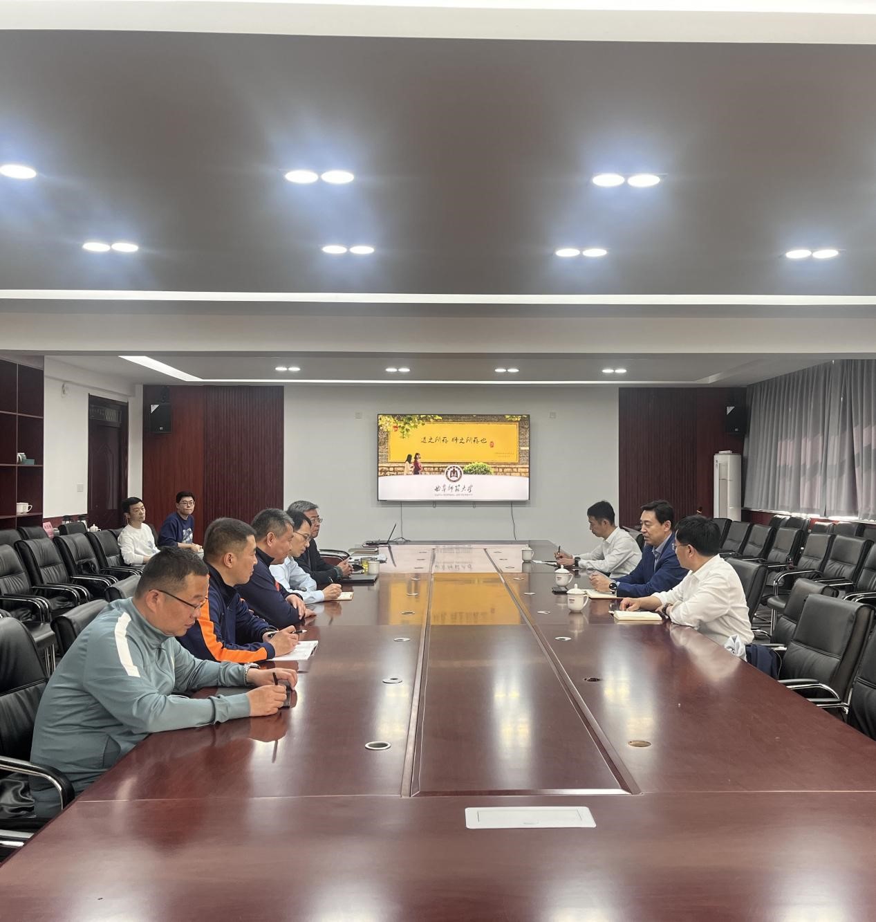 2024年4月12日,学校党委副书记、校长张洪海,教务处处长李傅山,党委办公室、学校办公室副主任鞠海彦一行莅临体育学部调研指导。体育学部党委书记许怀祥,体育学部主任兼2048核基地