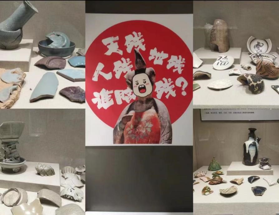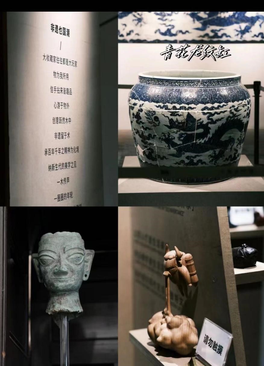 实践队员们来到了二号展厅,探索那一层层神秘面纱背后的娓娓道来。在中国传统的瓷器中“缸”是一种较为独特的瓷器,比一般的杯、盘、瓶罐等器形更为硕大,其表面使用苏麻尼青料绘制出双龙翻腾于祥云之中的图案,散发着青发色浓艳,栩栩如生,龙纹威武。由于龙缸胎体厚重,导致拉坯、利坯和烧窑难度极高,因胎厚而致受热不均使开窑时常常出现坠裂、惊碎的现象,是史上公认“最难烧的瓷器”。