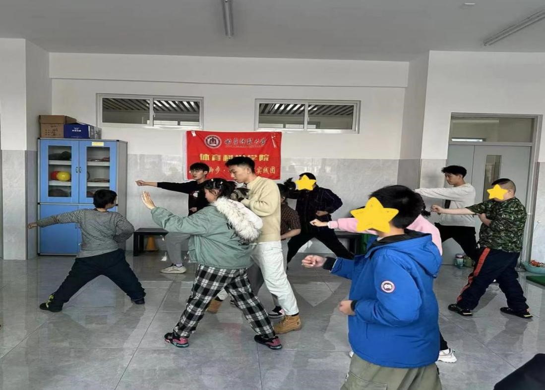 志愿者们结合自己专业知识为孩子们开展武术的基础动作教学,实践团中的武术老师们把大学必修课中的“中华武术操”一招一式完整地呈现在孩子们面前,孩子们投射出好奇、惊叹、向往的眼神。武术运动锻炼孩子们的协调能力,发展动作的协调性和灵活性,在武术基础动作的练习中孩子们增加了对武术运动的兴趣,感受武术带来的快乐。在教学过程中,志愿者们充分考虑了孩子们特殊的身体状况简化了武术操中的个别动作降低难度,增加了应用性,使孩子们可以将武术动作充分的展现出来。特殊教育学校里的孩子们多数存在智力和生理方面的障碍,例如马步、弓步、歇步等下肢力量动作,孩子们无法理解也无法掌控自己的动作表现,但队员们耐心细致,手把手的为孩子们纠正动作,使孩子们的动作逐渐规范。让孩子们在弓步、马步等动作过程中体验武术运动的乐趣。让孩子们愉悦身心,增强体质,建立积极的生活态度。