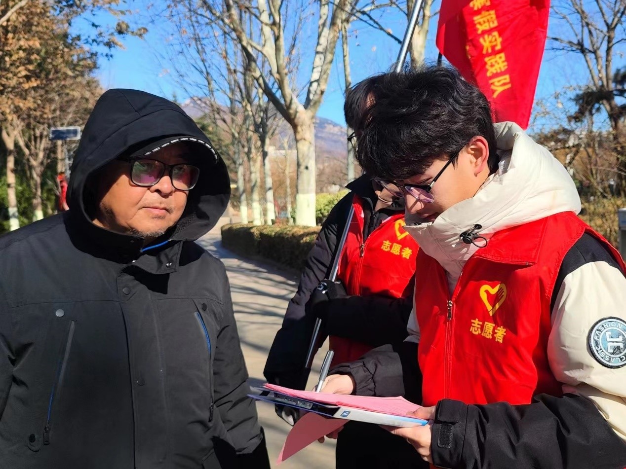 图为实践队员与安保人员进行问卷普及。吴鑫鑫 供图
