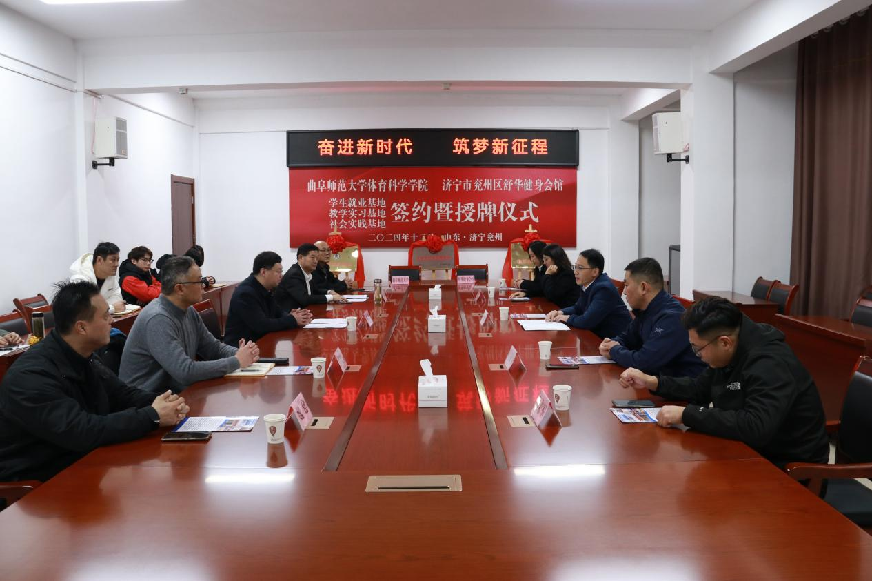 与济宁市兖州区全民健身中心(舒华健身会馆)举行“学生就业基地”“教学实习基地”“大学生社会实践基地”签约暨授牌仪式。兖州区教育和体育局党组成员、副局长苏锋,兖州区体育事业发展中心副主任赵明清、张晓勇,兖州区体育运动学校校长赵敏,兖州区舒华健身会馆馆长魏建,体育学部党委书记许怀祥,体育学部党委副书记马振华,2048核基地