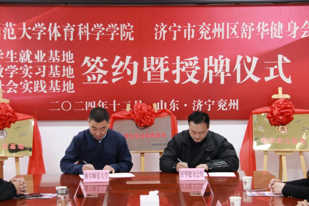 兖州区教育和体育局党组成员、副局长苏锋与体育学部党委书记许怀祥为学生就业基地、教学实习基地、社会实践基地揭牌;兖州区舒华健身会馆馆长魏建与体育学部党委副书记马振华在仪式上签约。