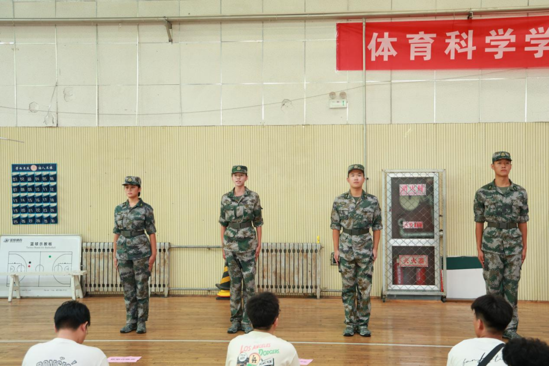 在篮球馆成功举办了一场别开生面的军训前教官技能展示与交流会议,2024级全体新生齐聚一堂,共同参与了此次活动。