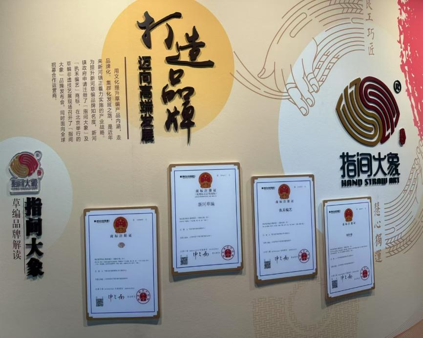 “指间大象”作为草编工艺的文创品牌,蕴含深厚文化与多重价值:“指间”突出草编为手工技艺,需艺人以手指精编细作。“大象”源于老子“大象无形”,象征草编艺术虽质朴,却蕴含无穷创造力与想象力。“指间大象”草编不仅在国内市场受到欢迎,还远销海外。新河镇的草编企业与山东高速集团及省内外部分旅游景区达成战略合作,在多个景点设置“非遗工坊”销售产品,2024年中国品牌日活动期间,“指间大象”展位现场售卖商品百余件,售卖金额达3万余元,并与“海南千年东坡老码头”非遗组织达成合作。