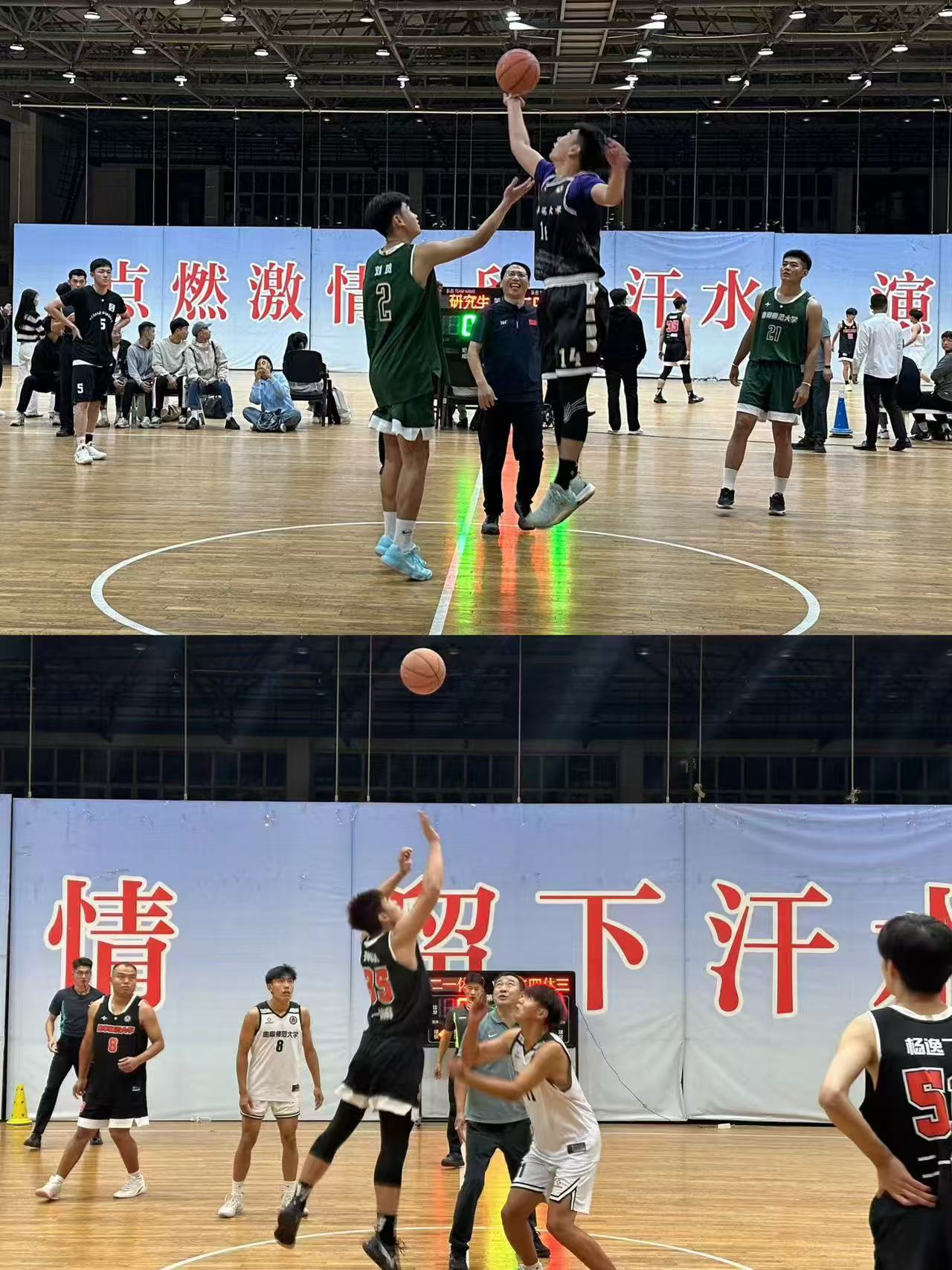 篮球联赛的开幕战尤为引人注目,两场精彩对决由体育学部党委书记许怀祥和体育学部党委副书记马振华亲自开球,这一极具象征意义的举动瞬间点燃了现场的气氛。球场上,运动员们个个生龙活虎,激情四溢。他们奔跑、跳跃、传球、投篮,每一个动作都展现出高超的技艺和顽强的拼搏精神。观众的欢呼声、呐喊声此起彼伏,整个篮球场成为一片欢乐的海洋。