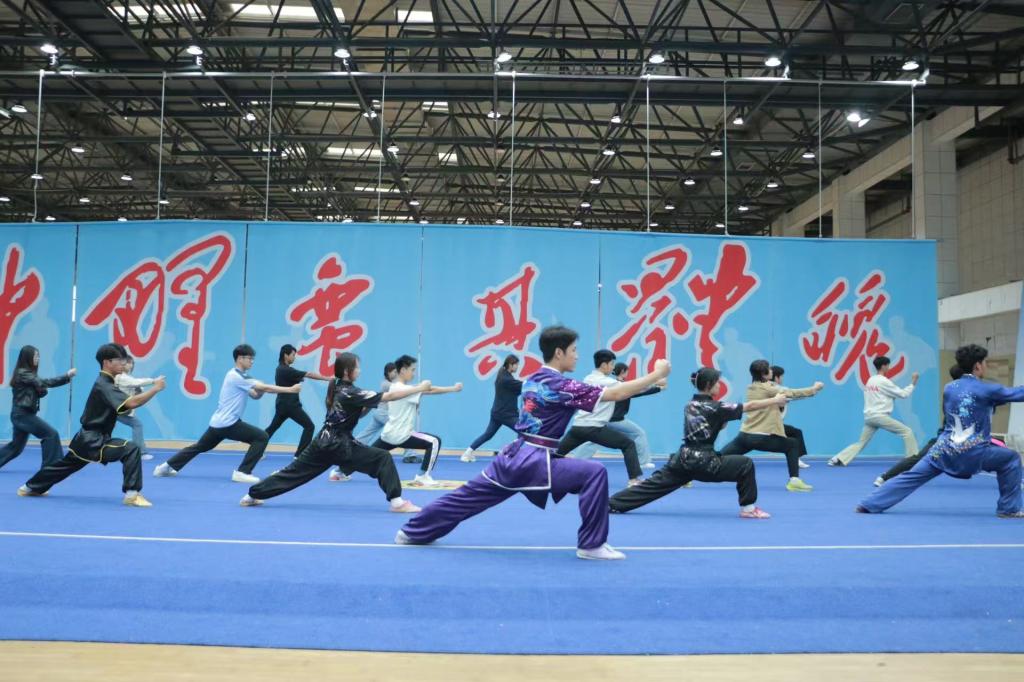 学生志愿者带领同学进行武术拳法基础动作)