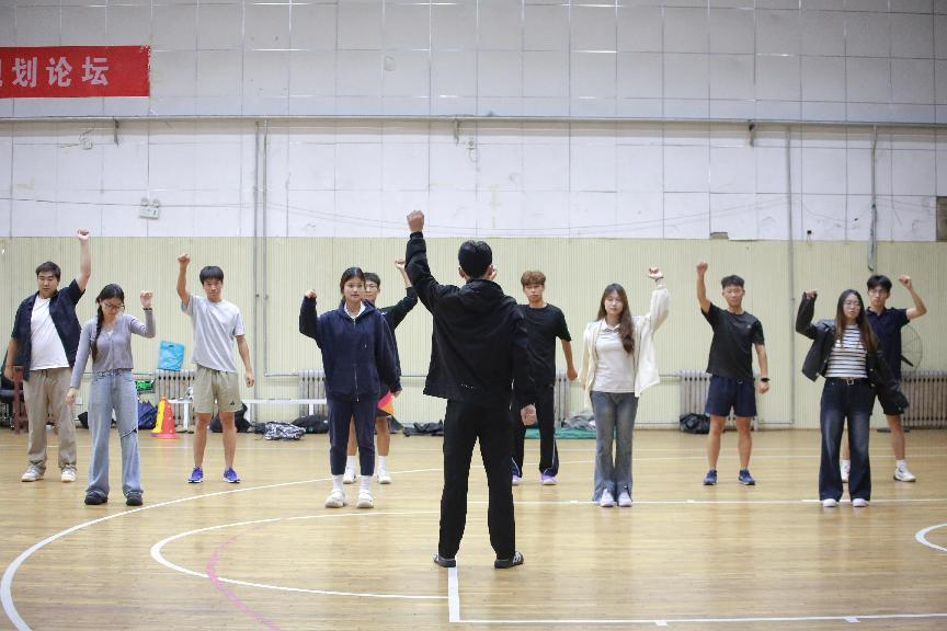 学生志愿者带领同学进行武术拳法基础动作的示范)