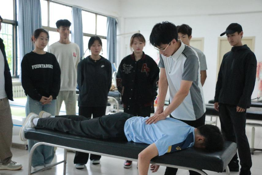 (图为同学参与运动康复其他位置的放松讲解)