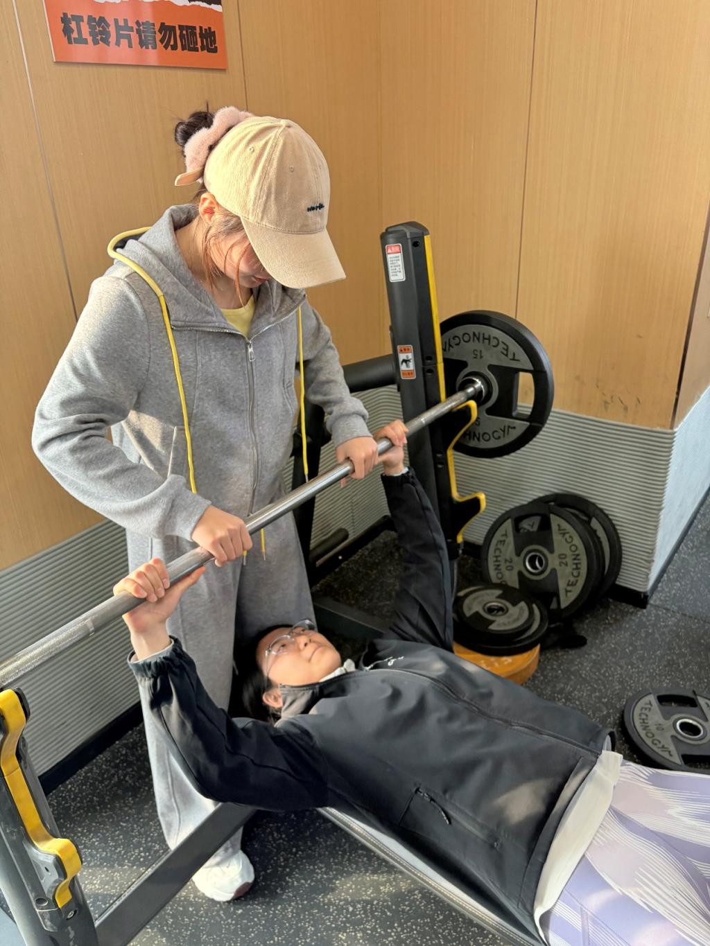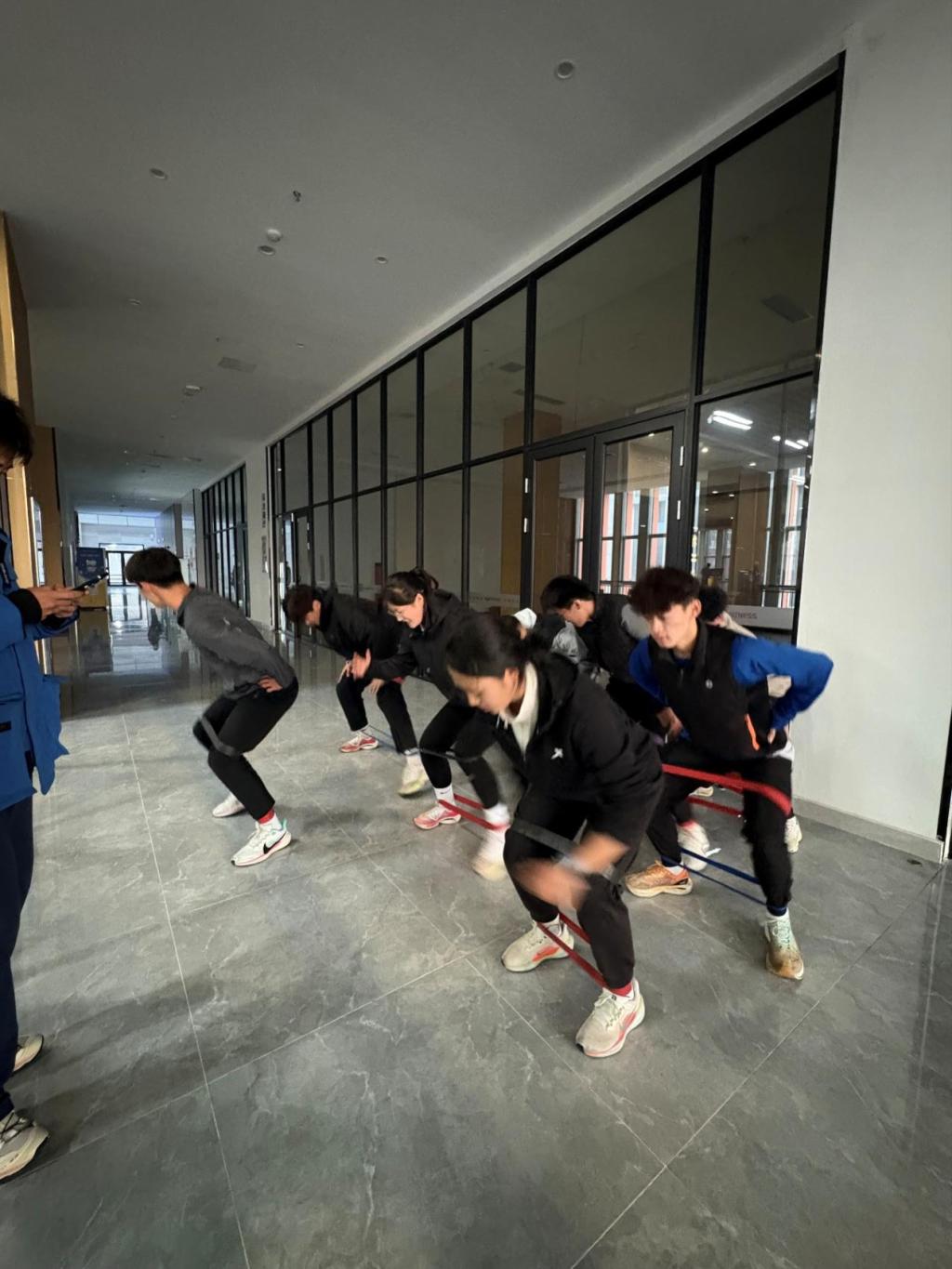 实践期间,队员们结合场地与训练队员需求,分场景开展精准帮扶:针对力量训练项目,队员一对一指导卧推、器械使用规范,帮助学生规避运动风险;围绕热身拉伸、体能训练等基础内容,队员带领学生开展高抬腿、动态拉伸等训练,结合运动生理学知识纠正动作发力方式,提升锻炼效率;室内空间:利用弹力带设计趣味团体训练项目,通过分组协作增强锻炼互动性,让学生在轻松氛围中提升身体素质。从器械实操到场地训练,从安全提示到动作优化,实践队以耐心细致的指导,让科学健身理念融入青少年日常锻炼。