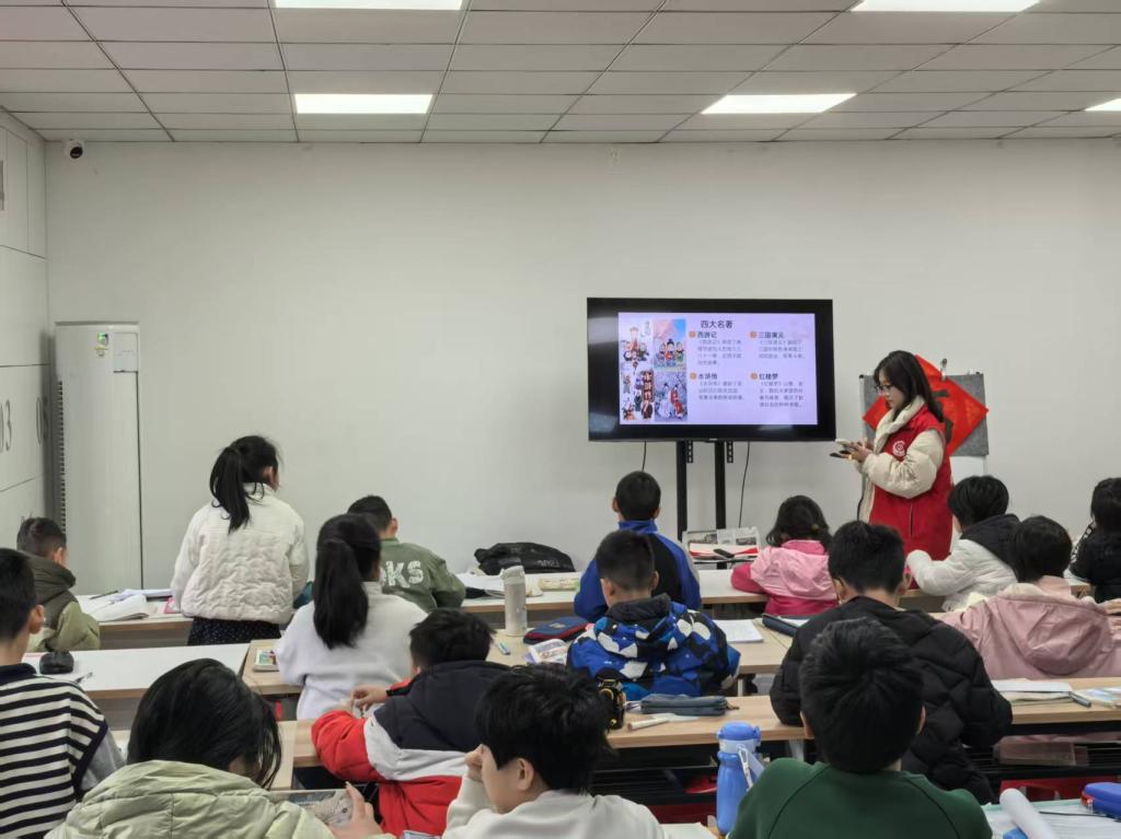 在托管班的教室里,处处可见学院学子忙碌的身影。他们化身“小老师”,有的在书桌前耐心辅导孩子们完成寒假作业,细致讲解每一道难题,帮助孩子们巩固知识;有的则通过生动的多媒体课件,带领孩子们走进“四大名著”的世界,从经典故事中感受中华优秀传统文化的魅力;还有的结合体育专业特色,穿插了趣味体育游戏和科学健身指导,在轻松互动中激发孩子们的运动热情,传递健康生活理念。此外,志愿者们还协助开展了安全教育、阅读陪伴等活动,全方位守护孩子们的成长。