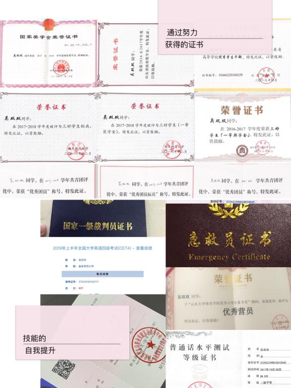 2019年获得山东省高等学校优秀学生干部、山东省优秀毕业生、校级优秀学生干部、校级五好学生标兵、校级五好学生、社会体育指导员证、健身教练国家资格证书、国家体操一级裁判证书;