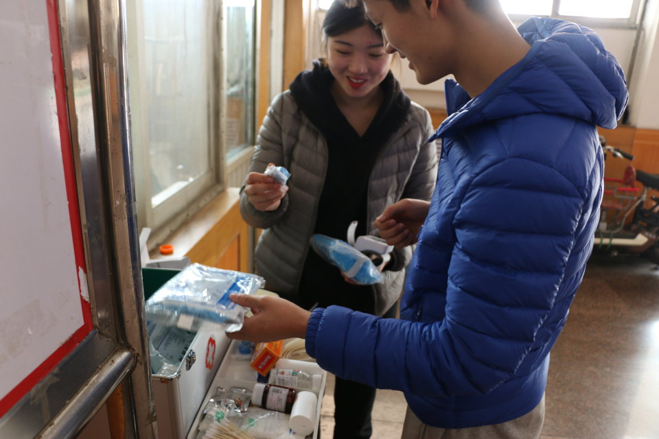院楼门厅,2016级管理班团支书、学院应急医疗志愿服务队队长吴双双正在协助同学使用新配备的电子血压计,旁边的桌上还放置着装满各类应急药品的药箱。
