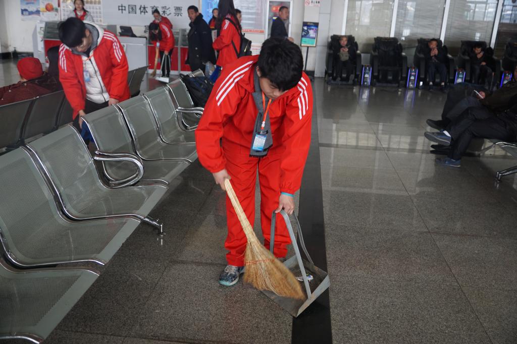 学生在院楼前准时集合。活动开始前,党委副书记展利民老师首先对全体志愿活动的学生进行讲话,说明了本次活动的注意事项。本次活动在两个地点同一时间进行,学生也分为两部分。一部分对曲阜市汽车站站内外的卫生进行打扫、对站内人员进行发车时刻表的发放,另一部分对学校家属院的卫生进行打扫。同学们展示出了对本次活动极高的积极性,并收到了家属院居民和汽车站工作人员的高度赞扬。